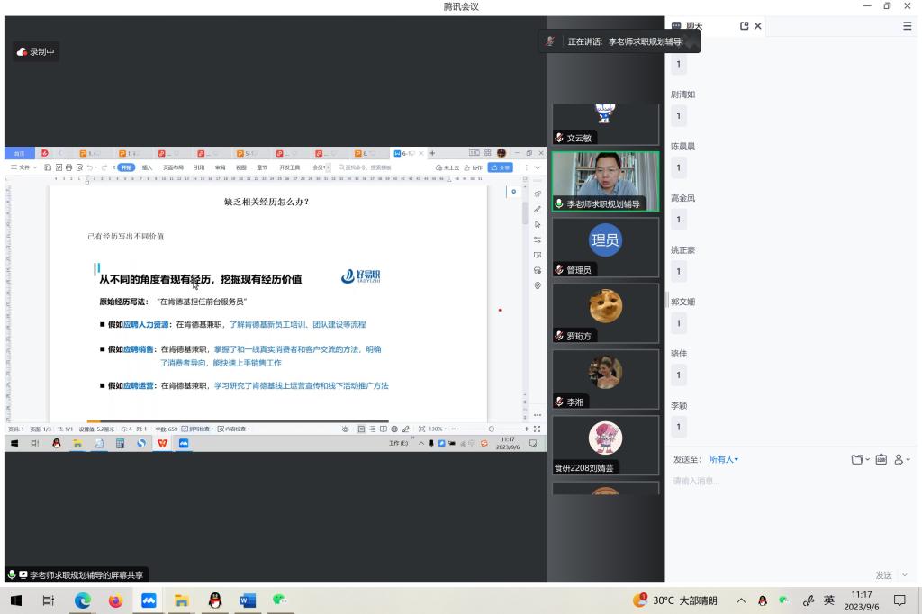 李健华老师就同学们最关注的简历撰写为主线进行展开讲解,简历中的每个部分都举出了大量的例子,让同学们更加深切的了解到面试官的想法,进而更好的拿到自己想要的offer。首先,李老师就简历排版问题入手,指出了大多数员工的简历通病 ——“模板化“,希望同学们能够通过学习,摒弃”电脑生成“,写出一份属于自己的简历。李老师先后通过如何在简历中提炼整理有效信息,如何挖掘现有的经历价值、缺乏相关经历情况下要怎么办等问题,结合丰富的案例,让同学们学会如何更好的制作简历。”对照岗位要求,以岗位为中心,写出对岗位的价值“,不只简单描述实习经历,另外对于毕业生找工作时,应当“知己知彼,百战不殆”,如何快速了解企业和岗位,包括了解其招聘需求、查阅公司官网、公司年报等。在讲解过程中同学们积极提问,李梓豪同学提出了关于管培生晋升的问题,“管培生一般以三年至五年为一个周期,一个周期后毕业生就会完成员工到职员身份的转变,这需要有一定的耐心,吃得了苦,熬得住。”