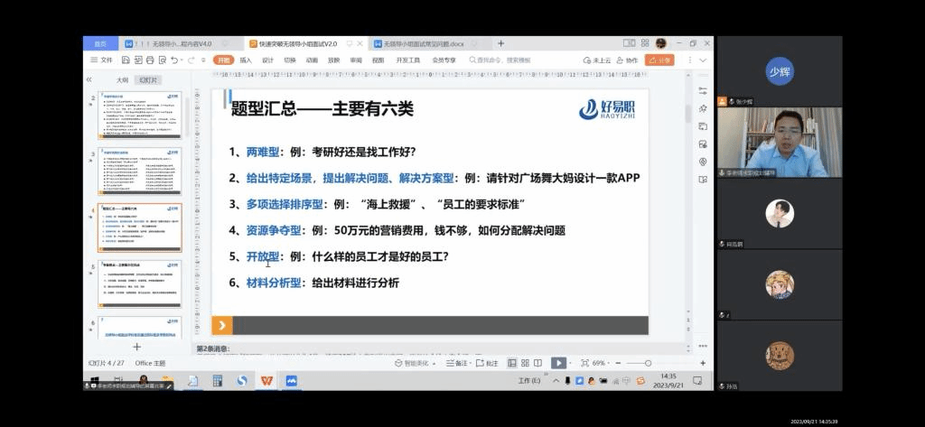 李老师从题型汇总展开,在一般的小组面试中大致分为六大类题目,主要考察面试者的能力是否达到要求、分析处理矛盾的能力是否过关、是否有团队精神和价值观是否与企业契合。