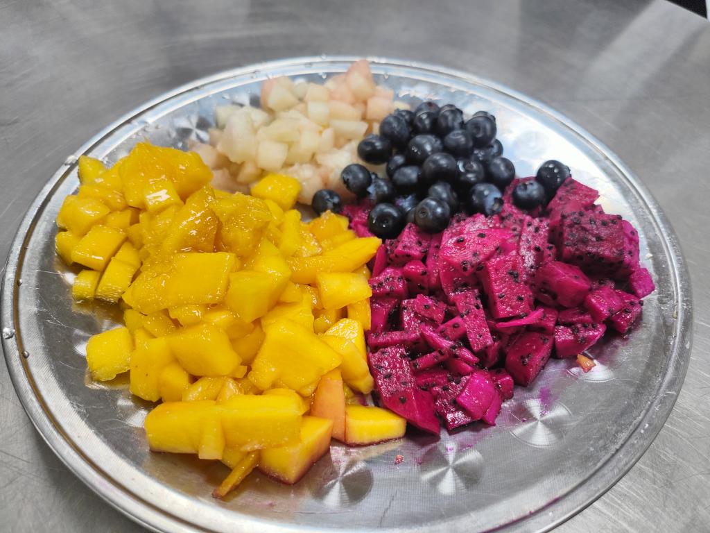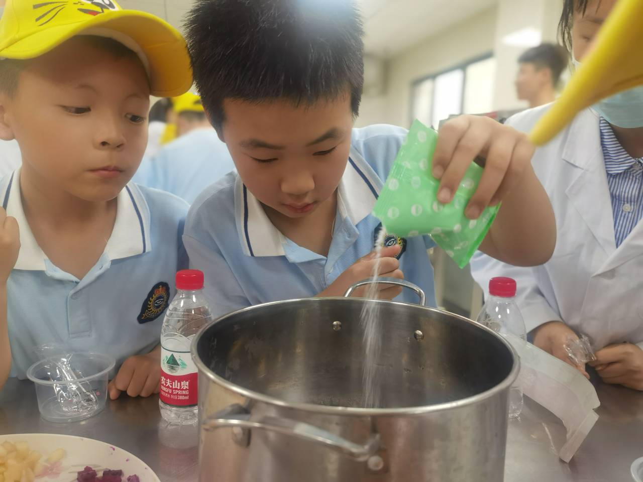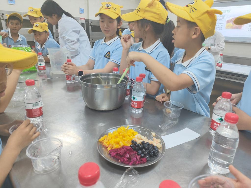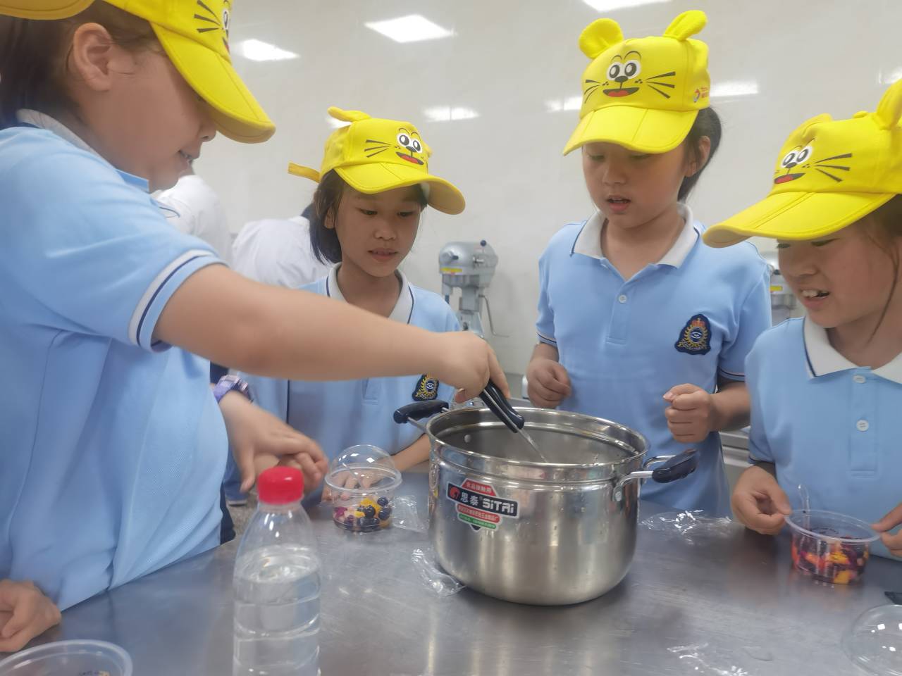 开始制作前,小朋友们在志愿者的引导下依次洗干净双手,任婧楠老师再次强调了制作过程中的安全注意事项。随后是果冻制作环节。小朋友们积极参与,勇敢尝试。在志愿者们的帮助下,小朋友们将喜欢的水果放于碗中,并将煮好的白凉粉倒入里面。