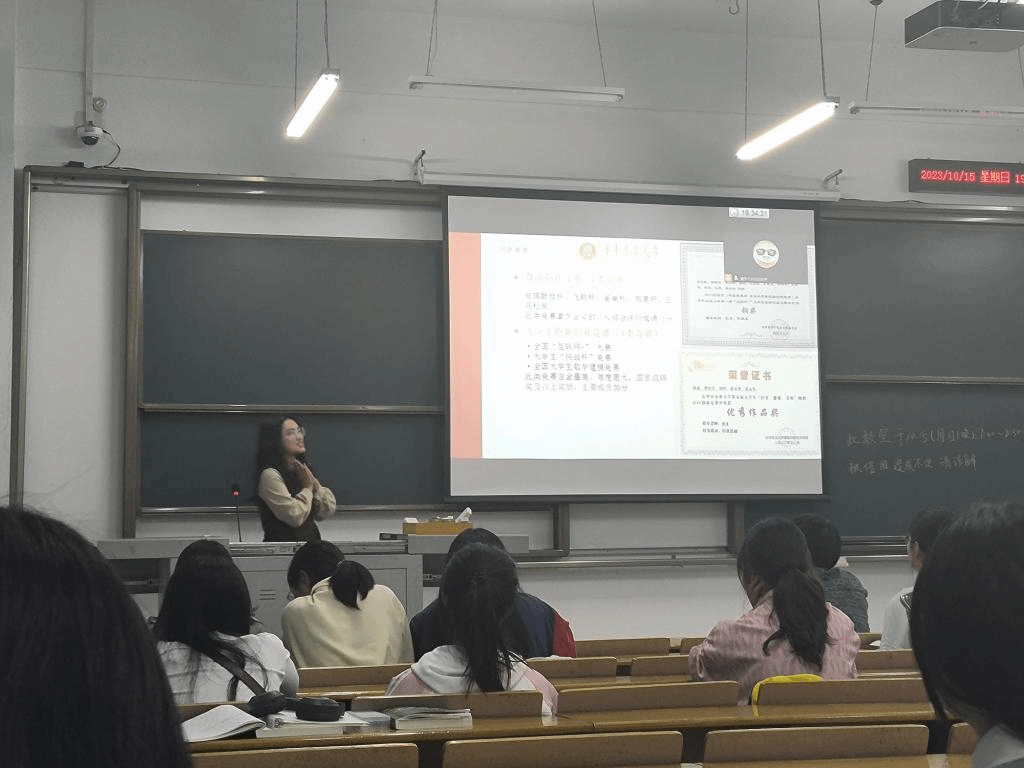 21级员工代表周怡同学针对比赛方面的问题为在场同学们做出细致剖析,她详细列举了同学们可以参加的比赛,为同学们开创了一片新的天地,接着她就“如何打好团队赛、个人赛”做了详细的解释,为在场的同学们提供了新的思想,新的路线。最后周怡同学说:你的大学,本该熠熠生辉。她鼓励同学们去做自己感兴趣的事情,去做对自己来说有意义的事情,不管这件事在别人眼里是否同样有意义。