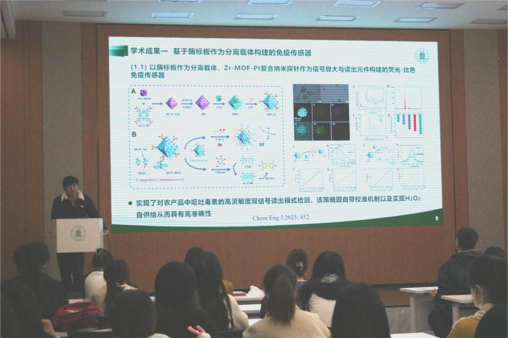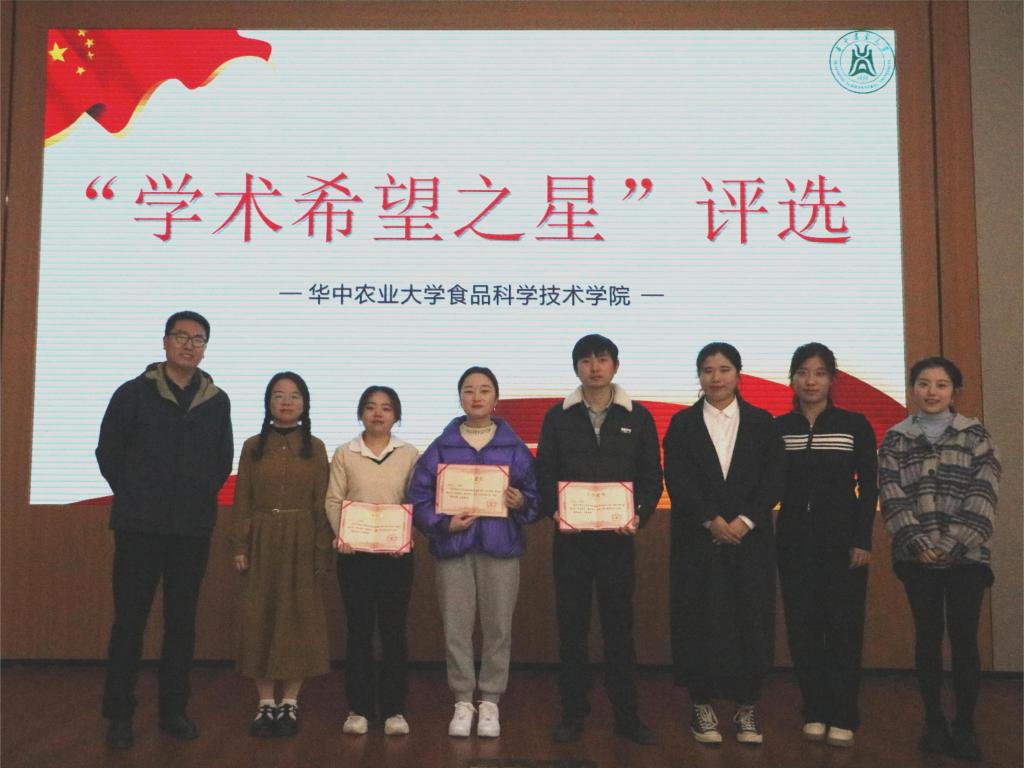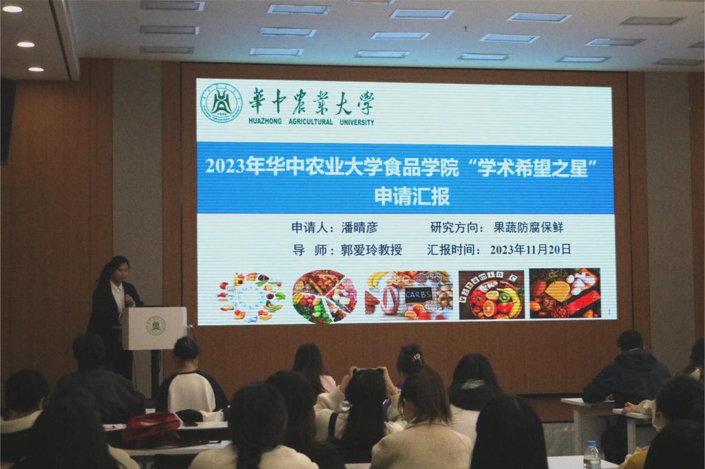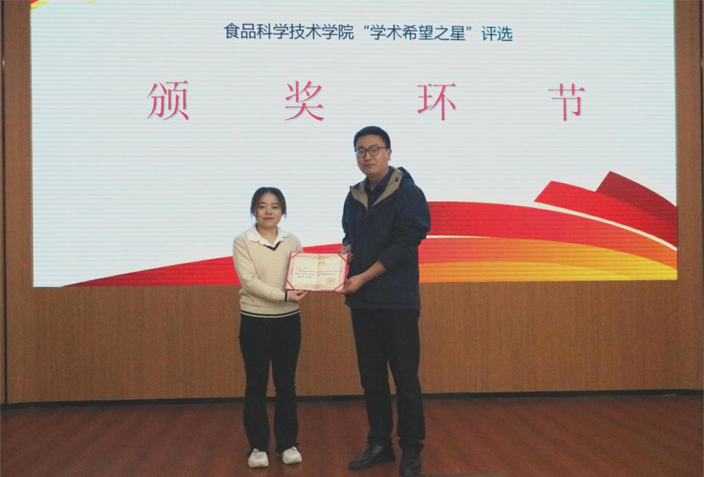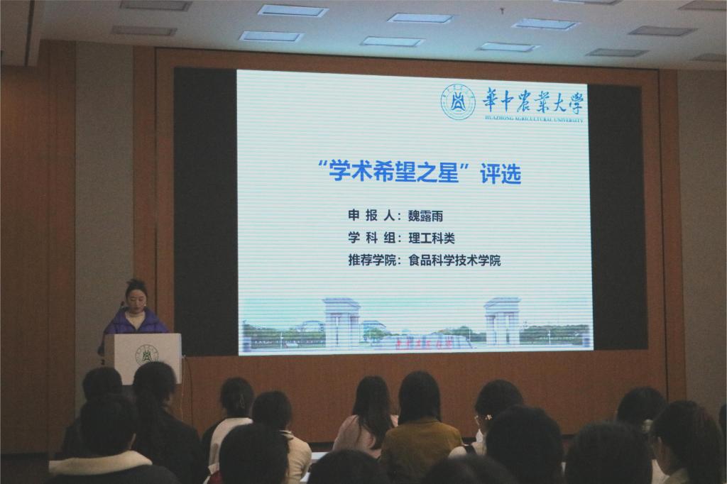 五位学术希望之星候选人洪峰、魏露雨、潘晴彦、齐亭亭、李琪琪参加了此次评选大会向现场师生评委做了汇报,分享了他们的学习及获奖经历。洪峰以全固态锂电池及免疫传感器等科研成果展开介绍。魏露雨以亲身经历食堂中毒事件为起谈起自己走上科研之路的决心,并介绍了溶胶-凝胶状态转变传感方法等研究成果。潘晴彦对热带水果绿色多功能涂膜保鲜材料等研究工作进行成果汇报,并将校训“勤读力耕,立己达人”作为学术理想。齐亭亭谈起实验课及专业课对自己的科研兴趣培养,对枇杷叶再利用及食堂食品检测等工作成果,在科研路上永不言弃砥砺前行的精神,科研之余还积极参加中国行食品志愿者活动,争做不负韶华砥砺前行的食品人。李琪琪以贮藏过程中咸蛋黄凝胶特性和脂质分布以及高品质咸蛋开发为主题汇报学术成果,以“悦纳自己的普通,承认自己的优秀,但我将永远保持谦卑”作为结束语。