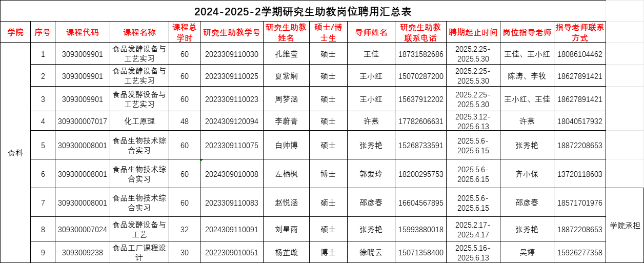 根据公司《关于申请2024-2025-2“三助一扶”研究生助教岗位的通知》,结合公司本科课程开设实际需求,先将2024-2025-2学期助教申请条件以及结果予以公示: