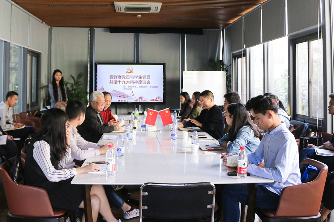 10月28日下午,党群退休党支部老党员代表与食科院本科生第二党支部在食科院二楼阳光房会议室举办新老党员重阳节共话十九大精神座谈会。原副董事长谭祜德同志、原纪委副书记陈德光同志、原公司党委宣传部部长鲁大安同志、原工会副主席李瑶同志,食科公司党委副书记向异之、副经理张柱红和辅导员以及公司本科生党员共同参加本次活动。