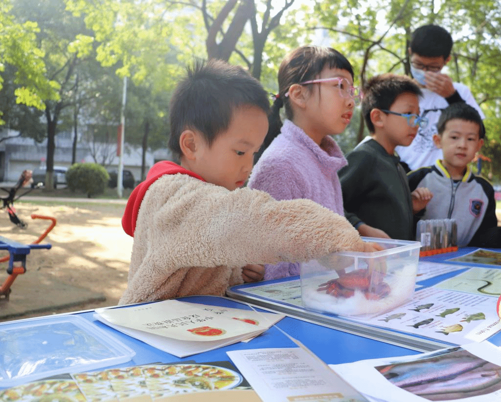 9:00,不少家长带着自己的孩子出门,这个时候本次志愿服务的另外一个小活动就可以开展了。在向小朋友教授常见鱼的识别方法,还可以观察志愿服务队带过来的标本。科普结束后,他们还可以进行鱼类涂鸦和小鱼拼图活动。在完成拼图以及绘制完一张图后,就可以获得许多水生生物的小知识,还可以从志愿者那里获得糖果或者贴纸奖励。小朋友都兴致高昂,学到了不少有趣的知识。