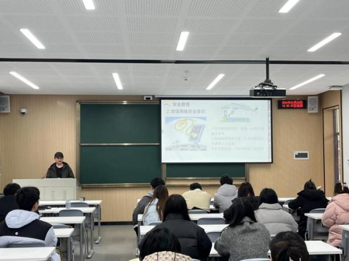 在食研2304班班会现场,班长代寒松首先对大家进行安全主题教育,告诫大家在新学期一定要保护好人身安全。随后班长分享对个人发展的思考,号召大家对自己的未来做好规划,为之后即将到来的申博、就业、考公考编做准备。除此之外,班长号召大家在新学期树立好科研目标,根据自身情况开展科研工作。最后对全班进行电车消防安全和防止电信诈骗主题教育学习。