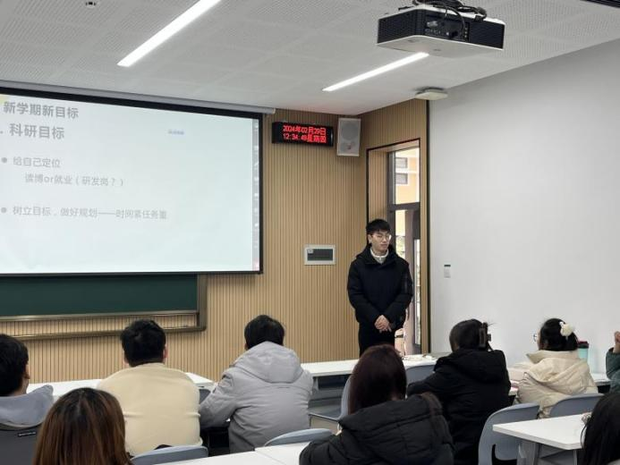在食研2204班班会现场,周海博同学根据自身情况做学术交流分享,主要包括文献检索、科研软件、综述写作几个方面。大家都表示收获良多。紧接着班长强调了消防安全、实验室安全及反诈宣传,主要是电动车的消防安全和防范电信诈骗。最后班主任任静楠根据自身经历向大家表示要以技多不压身、走的每一步都算数和脚踏实地的心态去搞科研,并向大家的新学期表达了美好的祝愿。